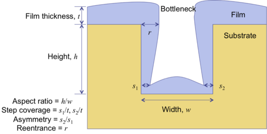⑥ Aspect Ratio, AR Aspect ratio는 박막이 특정 단차를 가지는 profile을 가질 때, 단차의 width와 height의 비율을 aspect ratio라고 합니다. 현재 소자 Dimension이 작아지면서 Aspect ratio가 점점 더 커지고 있습니다. 높은 Aspect ratio를 가지는 profile을 구현하기 위해서는 etching 기술이 핵심입니다. 뿐만 아니라 높은 Aspect ratio의 profile을 커버할 고도의 증착 기술이 요구되고 있습니다. → Aspect ratio = height / width