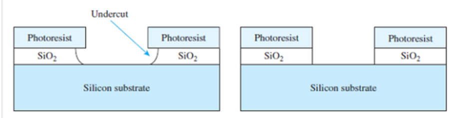 ② Overt etch & Undercut Over etch는 충분히 진행되어 원하는 두께나 깊이를 넘어서 식각된 상태를 말합니다. Undercut은 wet etching시 등방성으로 식각되면서 open된 영역보다 photoresist로 blocking된 하부막까지 etching되는 현상을 의미합니다.