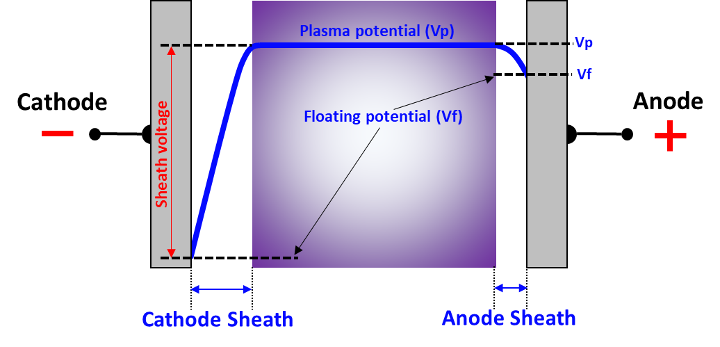 음극전압강하가 시작되는 곳에서 cathode까지의 potential drop이 나타나는 영역을 sheath 영역이라 표현하며, 이 때 sheath 영역 내의 전위차를 sheath 전압 혹은 sheath 전위라고 표현합니다.