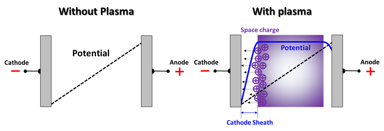 글로우 방전에서 cathode 쪽에 potential drop으로 sheath 영역이 생깁니다. 이는 양단의 전극에 바이어스를 인가한 경우, 전기장이 형성되고 방전에 의해 기체가 이온화 되어 플라즈마를 형성합니다. 이때 전자는 질량이 작기 때문에 빠른 속도로 anode로 이동하게 되고 크고 무거운 양이온은 cathode로 천천히 이동하게 됩니다. 전자는 cathode와의 반발력으로 cathode 주변에 존재하지 못하고 빠르게 양극쪽으로 이동하는 반면 양이온은 천천히 cathode 주변으로 이동하면서 축적됩니다. 따라서, cathode 앞에는 양이온의 밀도가 높은 영역이 형성됩니다. 모여든 양이온에 의해 전하가 축적되면서 공간전하를 만들게 됩니다.