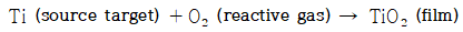 하지만 우리는 DC 파워만 보유하고 있습니다. 따라서 TiO2 소스타겟을 사용할 수 없게 됩니다. 하지만 우리는 TiO2 박막을 굳이 TiO2 타겟으로 형성할 필요가 없습니다. 다시 말해, Ti 원자와 Oxygen을 반응시켜주면 TiO2 박막을 형성할 수 있다는 것입니다.