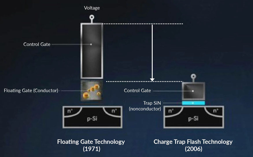 Trap이 많은 Nitride를 절연체로 사용하여 Trap 속에 전하를 가둠으로써 0과 1을 구분하는 방식입니다. 도체인 Floating gate가 데이터를 저장하던 기존 방식을 부도체인 Nitride가 대신함으로써 인접한 셀과의 혼선인 Cross talk를 원천적으로 차단하게 됩니다. 이러한 이유로 2006년에 당시 널리 쓰이던 Floating gate 기술의 한계를 극복한 혁신적인 기술인 Charge Trap Flash, CTF 낸드기술을 개발해 세계 최초로 40nm 32Gb 낸드플래시 메모리가 상용화됐습니다.