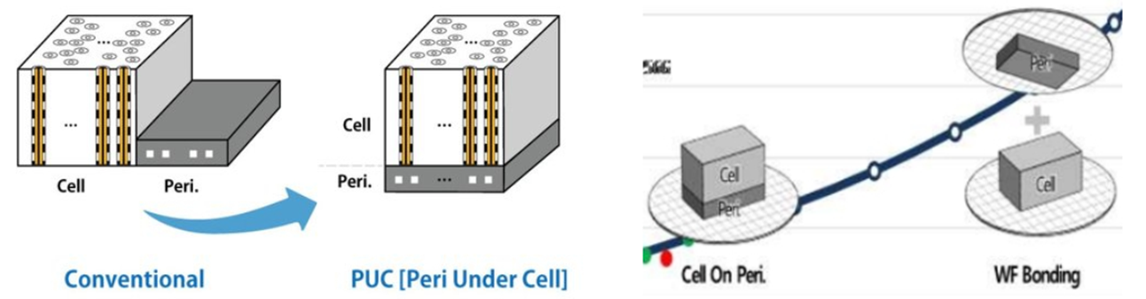 PUC는 Peri Under Cell로 기존 낸드플래시는 주변회로부가 Cell side에 위치했던 반면 PUC 기술은 주변회로부를 Cell 하단에 제조함으로써 집적도를 높이는 전략입니다. 이 기술은 주변회로부를 먼저 완성한 뒤에 바로 위에 셀 공정을 시작합니다. 또 다른 방법으로는 주변회로공정과 셀 공정을 개별적으로 진행한 후에 하나로 이어 붙이는 bonding 방식도 개발되고 있습니다. 최근 반도체 업계에서는 이러한 '이종접합' 패키징 기술들에 큰 관심을 가지고 있습니다.