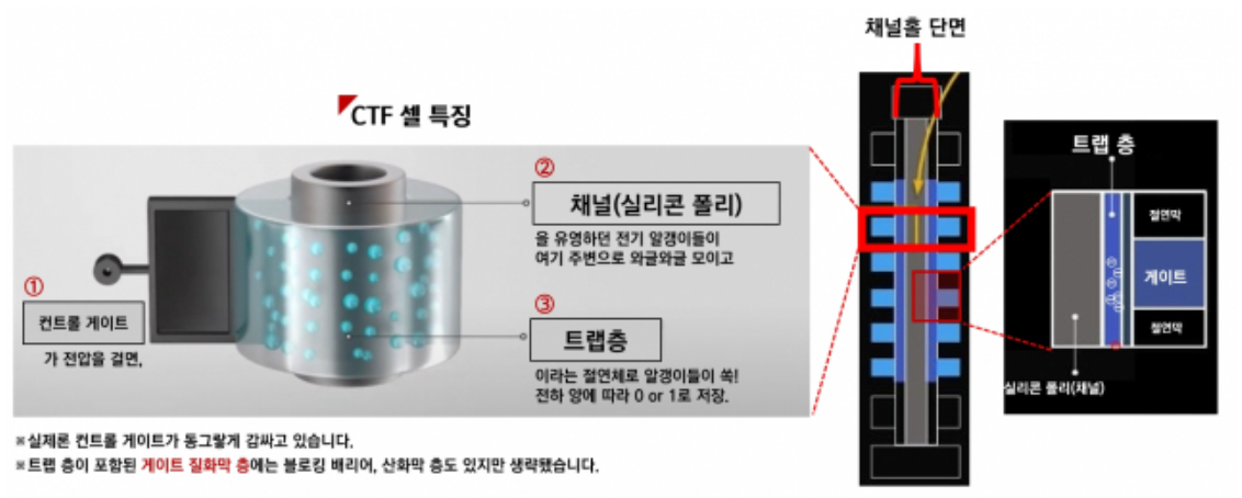 구현할 수는 있습니다. 예전 인텔 낸드사업부에서 96단 3D NAND Flash를 Floating gate 구조로 만들었다고 발표한적이 있습니다. 하지만 이미 3D NAND Flash에서는 CTF 방식으로 대세가 굳혀졌습니다. CTF 방식은 절연체인 Trap층이 도체인 Floating gate보다 3D NAND에서 더 큰 이점을 가집니다. Floating gate는 도체이기 때문에 3D 구조에서 이웃 셀간의 간섭이 심화됩니다. CTF 방식은 부도체이기 때문에 간섭이 훨씬 적습니다. 뿐만 아니라 Floating gate 구조보다 셀을 구성하는 부피가 훨씬 작기 때문에 채널홀을 더 작게 가져갈 수 있고, 이는 면적 축소가 핵심인 3D NAND의 집적도 차원에서 훨씬 유리합니다.