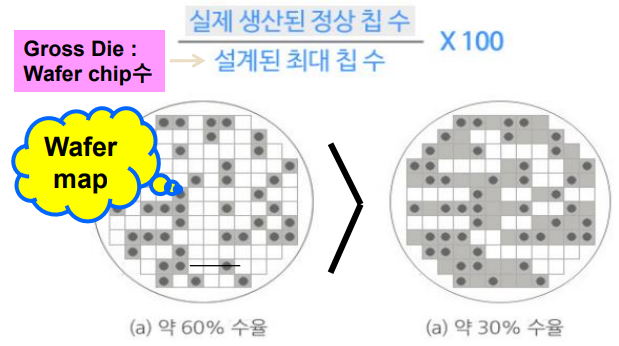 반도체 산업에서 생산성 향상의 최적 방안은 바로 수율을 향상시키는 것입니다. 수율을 향상시키면 Good die의 증가로 매출에 직접적인 영향을 미칩니다. 또한 Wafer, Chemical, Gas와 같은 원료 비용을 절감할 수 있습니다. 뿐만 아니라 수율향상은 인건비 절감, 전기, 설비 동작 시간 등 제조하는데 들어가는 비용을 절감함으로써 생산성 향상 효과를 낼 수 있습니다. 그래서 수율 향상이 반도체 산업에서 중요한 과제로 작용하는 것입니다.