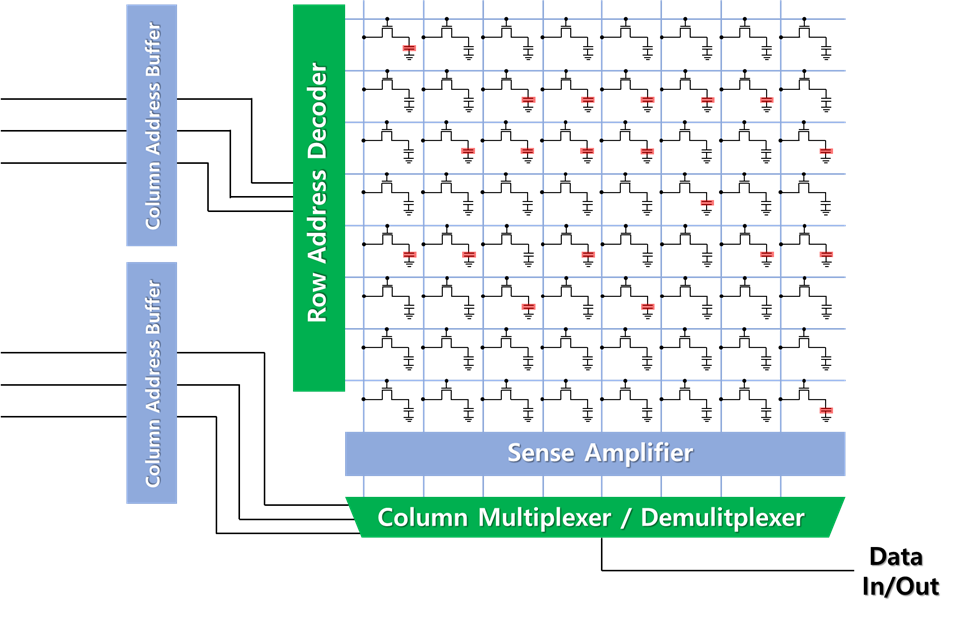 Dynamic Random Access Memory, DRAM은 각 셀이 Transistor와 Capacitor를 포함하는 사각형의 Array로 배열된 수십억개의 셀로 구성됩니다. Capacitor에 전자가 축적되면 '1', 방전되면 셀에 '0'이 기록됩니다. 각 트랜지스터는 수평 Word Line과 수직 Bit Line에 연결됩니다. word line은 transistor의 gate의 on/off를 담당하고, Bit Line은 data를 읽기/쓰기 역할을 수행합니다. 회로를 조금 더 단순하게 보기 위해 8 x 8 행과 열에 대한 메모리 Array를 지원하는 구성요소에 초점을 맞추어보도록 하겠습니다.