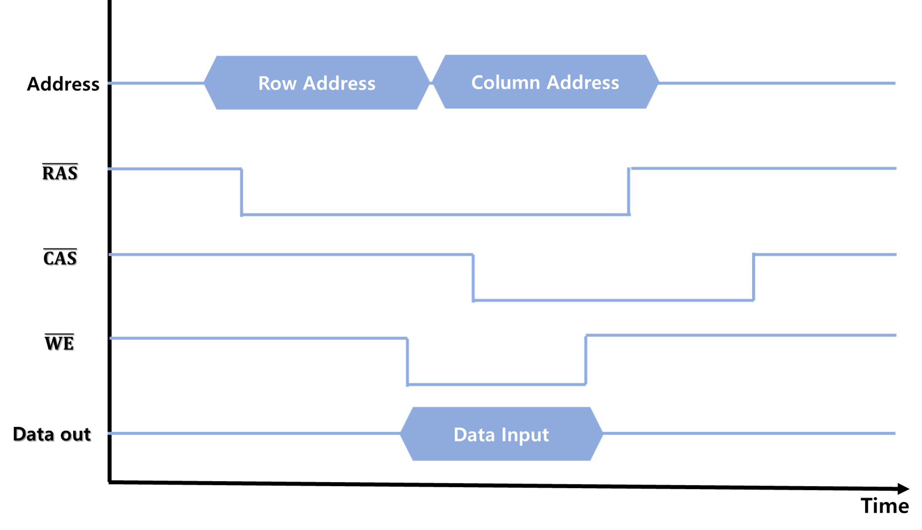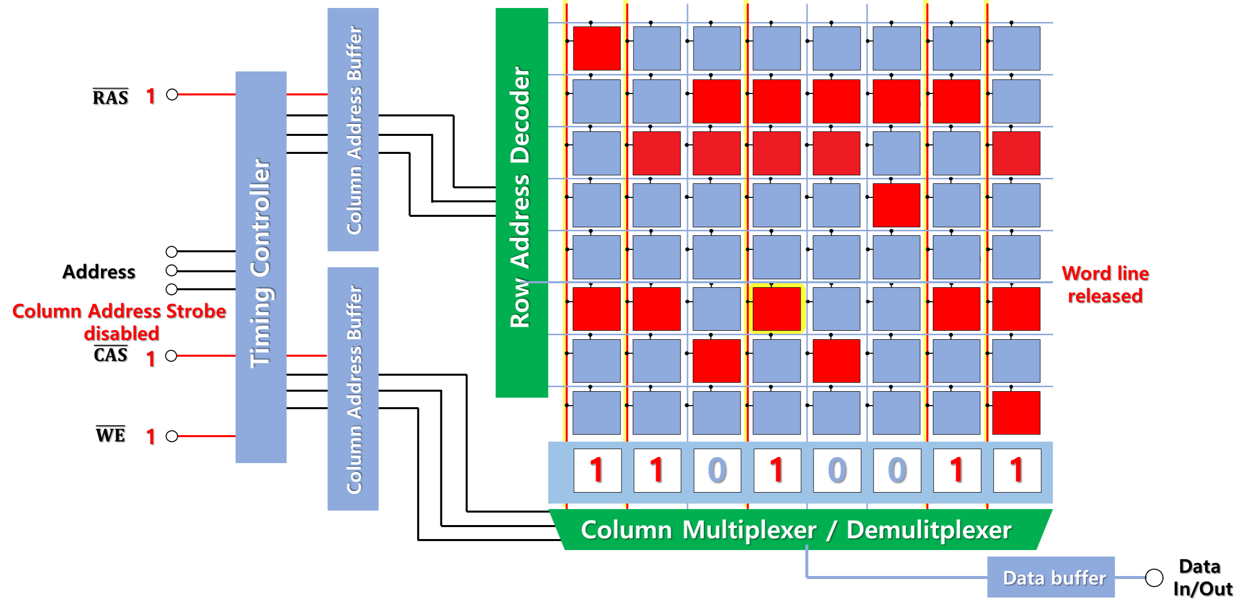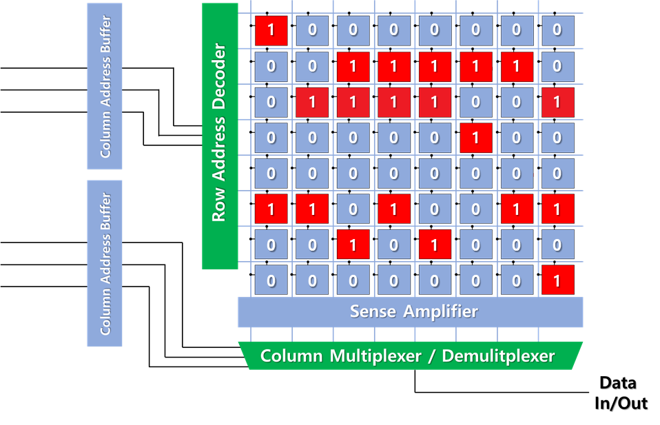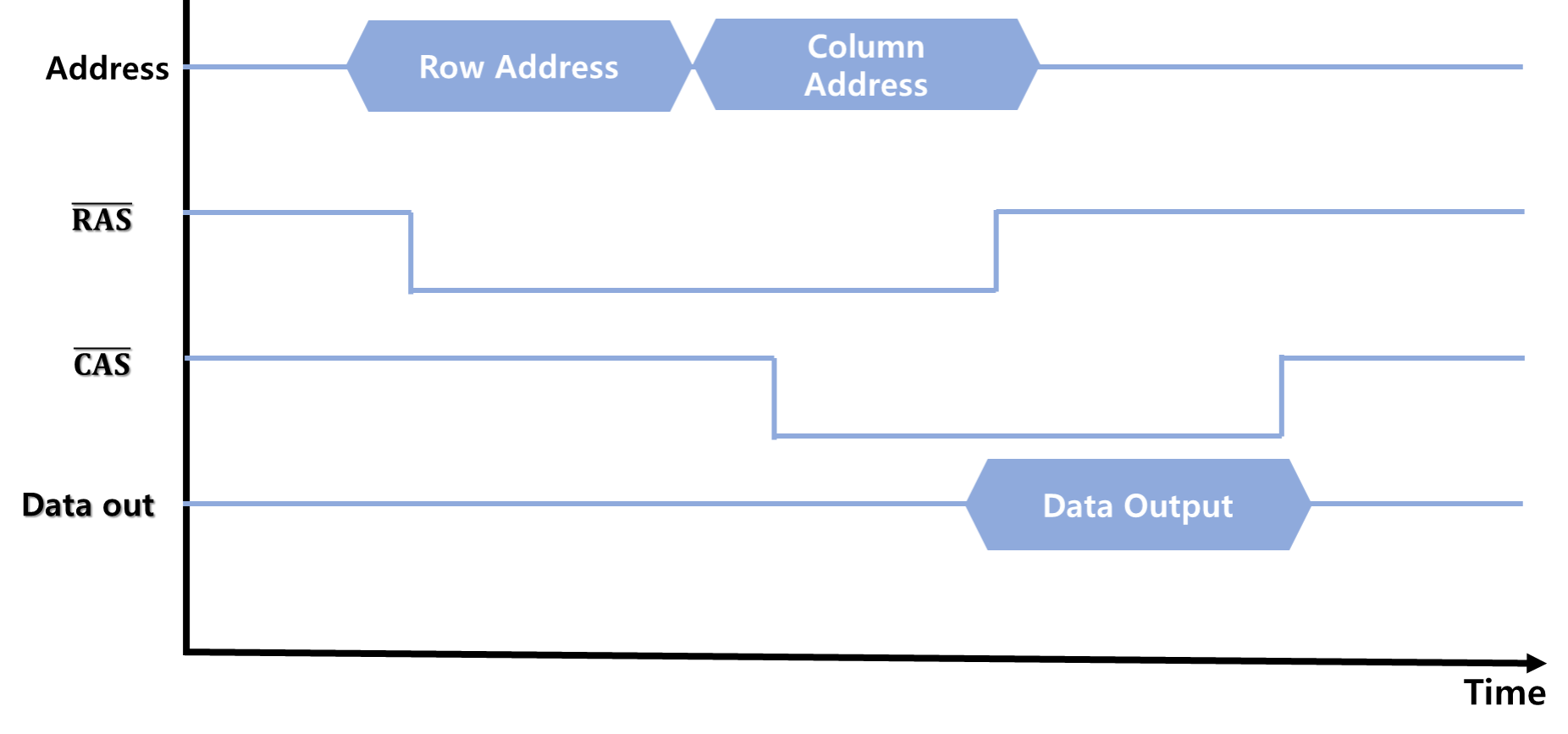 메모리는 정보를 저장(Write) 혹은 저장된 정보를 읽기(Read) 위해 셀 array의 열과 행으로 구성된 matrix 구조의 주소를 가지고 있습니다. 프로세서가 메모리에 있는 정보를 읽거나 기록할 때, 먼저 행에 신호 RAS를 보내고 나서 열에 CAS 신호를 보내어 Address를 확인합니다. 어떤 memory address에 데이터가 있는지 없는지는 CAS가 담당합니다. CAS 신호가 없어지면 그 Memory 주소에 새로운 정보를 다시 저장합니다.