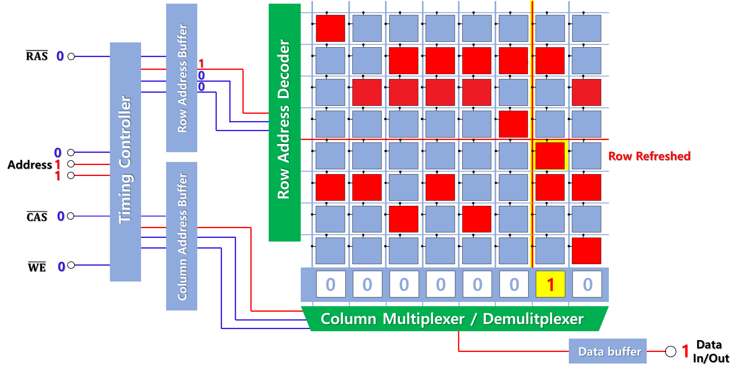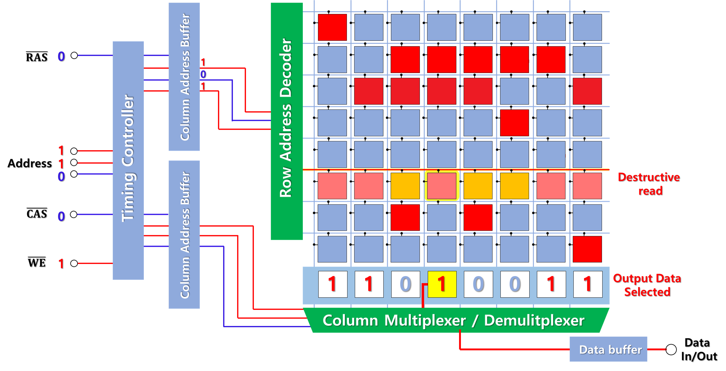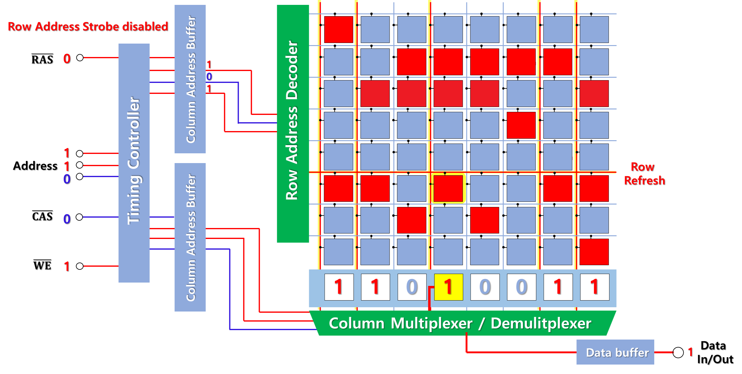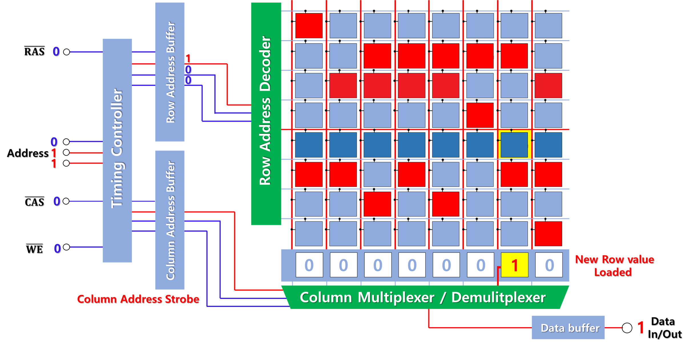 메모리는 정보를 저장(Write) 혹은 저장된 정보를 읽기(Read) 위해 셀 array의 열과 행으로 구성된 matrix 구조의 주소를 가지고 있습니다. 프로세서가 메모리에 있는 정보를 읽거나 기록할 때, 먼저 행에 신호 RAS를 보내고 나서 열에 CAS 신호를 보내어 Address를 확인합니다. 어떤 memory address에 데이터가 있는지 없는지는 CAS가 담당합니다. CAS 신호가 없어지면 그 Memory 주소에 새로운 정보를 다시 저장합니다.