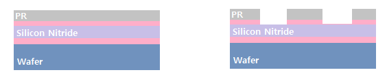 ■ Si3N4 wet etching process Silicon nitride, Si3N4 막은 농축된 HF나 BHF 그리고 H3PO4 인산용액을 이용하여 식각합니다. 더 우수한 선택적 식각을 위해서는 H3PO4 인산이 주로 사용됩니다. 인산은 Si3N4 식각속도가 SiO2 대비 10배의 빠른 속도를 가지고 식각 선택비가 매우 우수합니다. 하지만 인산으로 식각하는 과정에서 180℃ 이상의 발열이 발생하기 때문에 표면에 PR 유기막이 남아있다면 경화되기 때문에 제거가 어렵습니다. 따라서 PR을 쉽게 제거하기 위해 Si3N4 위에 얇은 SiO2 막을 형성한 뒤에 패터닝과 식각을 진행합니다. 그러면 BHF를 이용하여 SiO2를 제거하고 쉽게 PR을 제거할 수 있습니다. 질화막 식각 중 PR이 유착되는 것을 방지하기 위해 얇은 산화막을 증착함 ■ Poly-Si wet etching process Poly-Si의 경우 단결정 Si와 wet etching 방식이 유사하나 Poly-Si는 Grain boundary가 있어 Etch rate이 단결정 Si에 비해 훨씬 빠릅니다. 식각 용액은 하부막에 있는 산화막과 반응하지 않는 etchant를 사용하며, Poly-Si의 불순물 도핑농도와 온도는 Etch rate에 크게 영향을 미칩니다. 그리고 한 가지 특징으로 Poly-Si는 방향성이 없는 다결정이기에 등방성 etch profile을 가집니다. (단결정에서는 HNO3+HF에서 등방성, KOH, IPA에서는 이방성 특징)