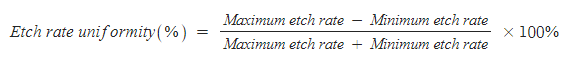 모든 공정에서는 Uniformity가 요구됩니다. 그 이유는 한 장의 웨이퍼 위에 수많은 칩이 동일한 성능을 내기 위해서는 uniformity가 요구되고 이는 곧 수율과 직결되기 때문입니다. 에칭에서는 식각 속도를 균일하게 달성하는 것이 매우 중요합니다. 웨이퍼/웨이퍼, 공정의 전과 후, 패턴 집적도와 패턴 크기 등 작은 오차라도 생기면 수율 저하에 요인이 되기 때문입니다. Etch rate uniformity는 (↓) 구할 수 있습니다.