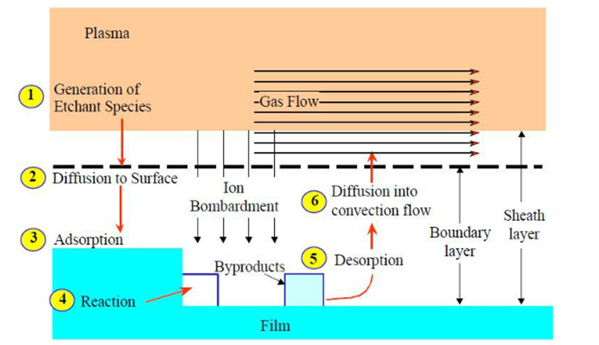 RIE의 메커니즘은 크게 6가지로 구분할 수 있습니다. 먼저 ① glow discharge에 의해 plasma가 형성됩니다. plasma 내의 양이온과 radical이 RIE 메커니즘에 기여 한다고 할 수 있습니다. ② plasma 내의 etchant 물질이 확산되어 target 표면으로 이동합니다. ③ 표면으로 이동한 etchant 물질은 target 표면에 흡착되고, ④ 양이온 충돌(ion bombardment)로 분자간 결합이 약해진 영역은 흡착된 etchant 물질과 쉽게 반응하여 휘발성 화합물을 생성합니다. ⑤ 생성된 화합물들은 표면으로부터 탈착되고, ⑥ 확산에 의해 기체 층으로 이동하고, 진공장비에 의해 배출됩니다.