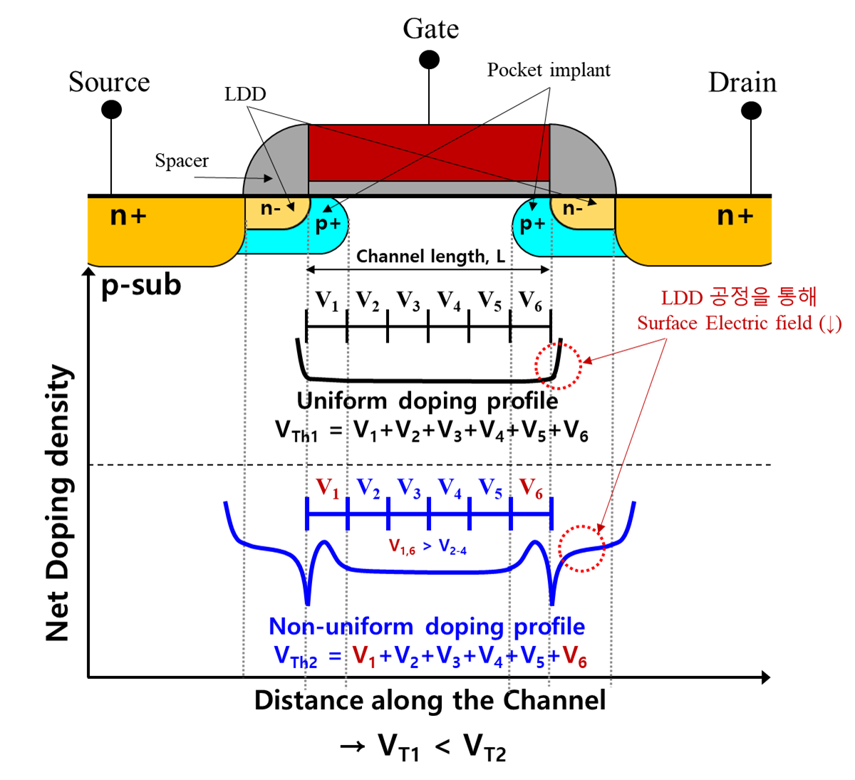Halo Doping (or Pocket Implant)는 Source / Drain와 Substrate 간 Contact 영역을 High p+ Doping을 해주는 기법입니다. Junction Edge에서 Substrate 방향으로 Depletion Region 확장을 억제하면서 Punch Through 현상을 방지할 수 있습니다. High p+ Doping에 의해 Potential Barrier를 상승시키면서 p+ Doping 영역에 Channel Thickness가 감소하게 됩니다. 그로 인해 Carrier가 Channel에 갇히게 되고 Channel에 Carrier Concentration이 증가하여 Vt를 상승시킵니다. 이를 좀 더 간단하게 설명드리자면, 전체 채널 영역을 아래와 같이 여러 구간으로 나눕니다. Na Doping 농도가 높으면 Vt가 증가하는 것은 알고 계실 것입니다. Uniform Body Doping의 경우 V1~V6 모두 같은 전위 값을 가지지만, Halo p+ Doping이 적용된 소자의 경우 V1=V6 > V2-V4 이기 때문에 전체 평균 Vt가 기존 Uniform Doping Profile보다 향상되는 것을 알 수 있습니다. 그리고 아래와 같이 LDD 공정이 적용되면 Drain과 Body가 맞닿는 부분의 Doping 농도 차이를 줄여줌으로써 Electric Field가 완화되면서 SCE를 억제할 수 있습니다.
