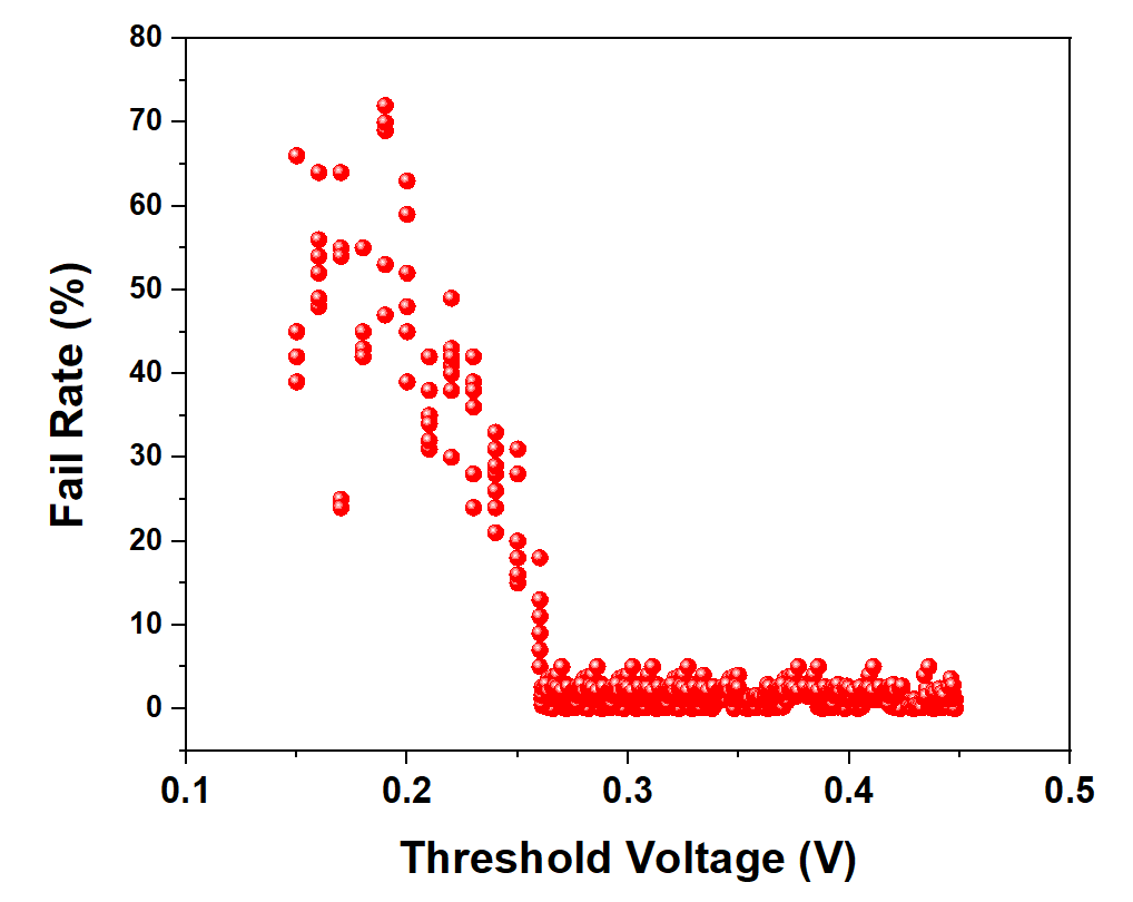 상관성 분석은 시각적으로 두 변수간의 관계가 어떤지 파악하기 위한 방법입니다. 반도체 Chip을 제조하는 과정에서는 Target 조건을 검증하고 양산에 이르기까지 수많은 Test 과정을 거칩니다. 특히 개별 Wafer에 대한 PCM Data, Probe Test를 통해 얻은 수율 Data에 대해서 상관성을 분석하고 수율을 개선하기 위해 조정하거나 변경해야 할 공정을 선정할 수 있습니다. 아래 데이터는 제가 임의로 작성한 Threshold Voltage에 따른 Fail Rate을 나타낸 경우입니다. X축은 Threshold Voltage이고, Y축은 불량률입니다. 각각의 Point는 Wafer 한 장당 각각의 Threshold Voltage와 불량률을 나타낸다고 가정합니다. 아래 그래프를 통해 알 수 있는 점은 Threshold Voltage가 감소함에 따라 다양한 Issue가 존재한다는 것을 이미 배웠습니다. Threshold Voltage가 감소하는 대표적인 경우는 바로 Gate CD가 감소하는 경우입니다. Gate CD가 감소하면서 Charge Sharing Effect나 DIBL 현상에 의해 Vt roll-off 현상이 발생하고 그에 따른 Channel Potential이 낮아지면서 더 이상 Gate Bias에 의해 Current를 제어할 수 없게 됩니다. 그래서 Leakage Current가 증가하고 Fail이 커지면서 수율이 저하될 수 있습니다. 만일 아래 그래프가 실제 Data라 하면, 우리는 Vt를 0.26V 이상으로 공정을 최적화 시켜야만 수율을 개선시킬 수 있음을 평가할 수 있습니다.