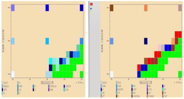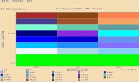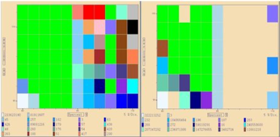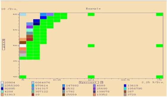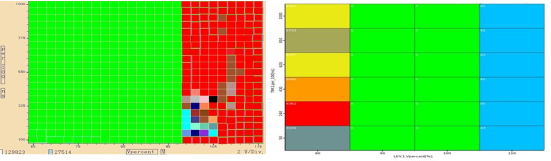 Example #1: 아래 Shmoo Plot은 Scan Chain Failing에 관한 것으로 부적절한 진폭 및 히스테리시스 설정의 문제가 있음. Shmoo Plot depicting failure because of improper amplitude and hysteresis settings. Example #2 : 아래 사례는 단 하나의 색상만 존재하는 것을 확인할 수 있음. 이는 단 하나의 오류만이 존재함을 나타내며, 하나의 싸이클 유형만 실패하고 있음을 나타냄. Single-Cycle Failure Example #3 : Example #2와 달리 많은 색상이 나타났고, 이는 여러 Cycle이 실패하고 있음을 나타냄. Multiple Cycle Failure