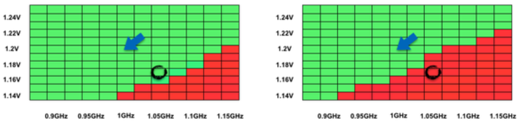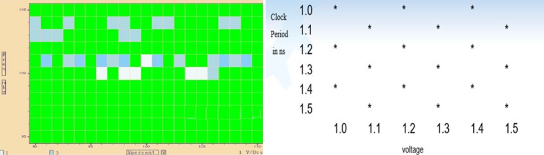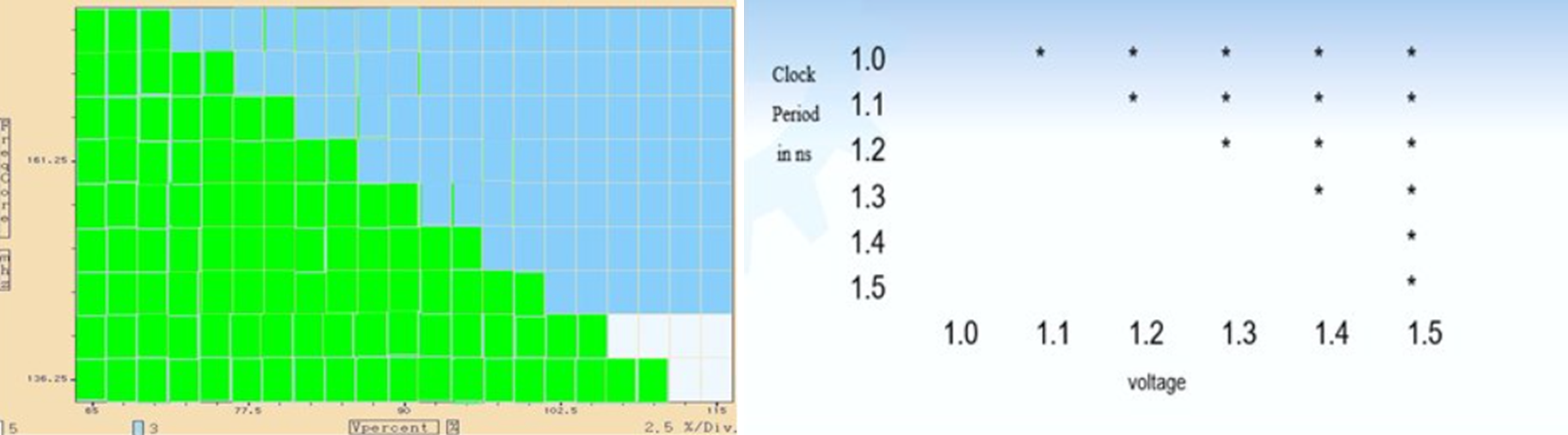 ② Shmoo Plot 측정 목적 Shmoo Plot을 측정하는 목적은 Chip 설계의 마진이 충분한지 혹은 불량품을 걸러내기 위한 측정 조건을 찾기 위함입니다. 예를 들어 1.2V 전압에서 1GHz로 동작하는 칩을 설계했다고 가정했을 때, 아래와 같이 좌측, 우측 Shmoo Plot은 각각 설계 마진이 충분한 칩과 마진이 작은 칩에 대한 결과를 보여줍니다. 파란색 화살표로 표시해놓은 부분이 설계한 Chip의 동작 조건이라고 했을 때, 좌측 Shmoo Plot은 동작조건으로부터 넓은 영역까지 녹색으로 표시된 Pass 영역이 분포하지만, 우측에 마진이 부족한 Chip의 Shmoo Plot은 동작조건에서 조금만 벗어나도 적색의 Fail 영역을 만나게 됩니다. 출처 : donghyun egloos