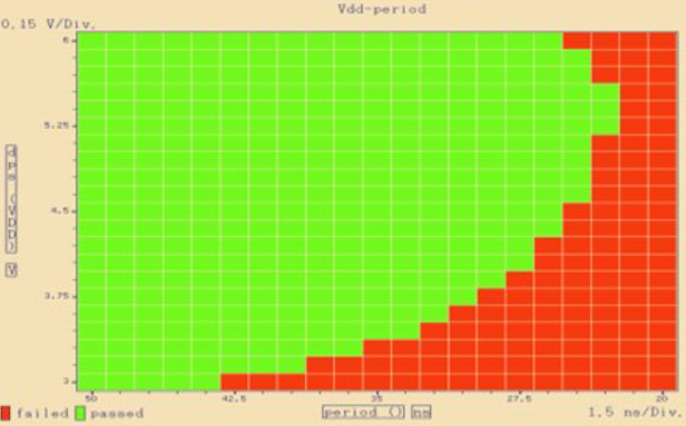 특정한 동작속도 영역에 대해서만 동작하는 Analog Circuit이 포함된 경우 동작속도가 낮은 부분에서도 Fail이 나타나기도 하고, 예상한 그래프와 달리 다른 모양의 Shmoo Plot이 얻어질 수도 있습니다. Shmoo Plot을 측정할 때에는 Test Vector도 중요하지만 Test Vector가 취약한 부분에 대한 동작을 포함하지 않는 경우 설계 마진이 크든 적든 모두 비슷한 Shmoo Plot을 얻기도 합니다.