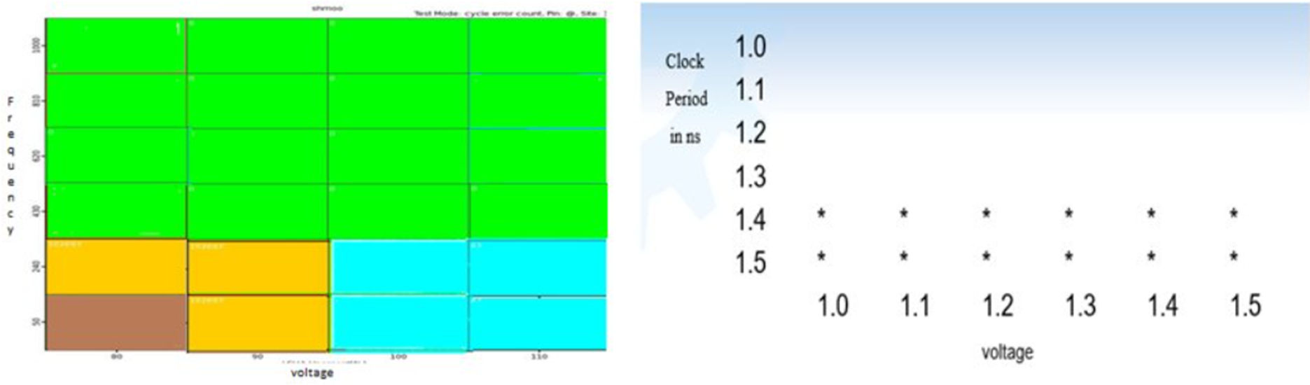 우리는 Normal Shmoo에 대해서만 다루어보도록 하겠습니다. 앞서 설명드린 것처럼 Shmoo Plot은 생산된 반도체 Chip이 전압, 동작속도, 온도 등 다양한 조건의 조합에서 정상적으로 동작하는지 측정한 결과를 2차원의 그래프로 표현합니다. 일반적으로 Shmoo Plot은 위와 같이 전압과 동작속도로 나타냅니다. 각 칸의 위치에 해당하는 전압과 동작속도의 조합에서 특정한 Test Vector의 실행 결과를 확인하고 Pass일 경우는 녹색, Fail의 경우 적색으로 표현합니다. 만일, Shmoo Plot이 800칸이라면 총 800회의 측정을 진행한 것입니다. 물론 이러한 측정은 ATE (Automatic Test Equipment) 장비로 수행되기 때문에 빠른 시간 내에 측정이 완료됩니다.