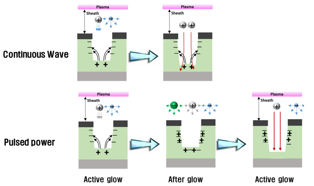Continuous Wave Plasma, CW는 지속적으로 Plasma를 켜놓은 상태로 100%라고 표현할 수 있습니다. 이때, 90%, 70%, 50% 와 같이 Plasma 상태가 On/Off 되어 있는 비율을 나타냅니다. Pulsed Plasma Etch는 Plasma가 Off 상태에 있는 주기에 Byproduct가 Pumping Out 되면서 잔여 Byproduct에 의해 Etch Rate이 저하되는 Micro Loading Effect를 효율적으로 개선할 수 있습니다. 또한, CW 이용시 Plasma 내에 Positive Ion에 의해서 Trench 현상이 발생합니다. Plasma는 주로 Positive Ion을 활용합니다. Target 박막을 Etching 할 때, 산화막에 Positive Charge가 Charging 되면서 Coulomb's Force에 의해 입사하는 이온의 Path가 휘어지면서 원하지 않는 Profile을 형성할 수 있습니다. Pulsed Plasma 기술을 적용하면 On/Off 하면서 순간적으로 Off인 순간에 Charging된 면의 전하를 제거해줌으로써 이를 개선시킬 수 있습니다.