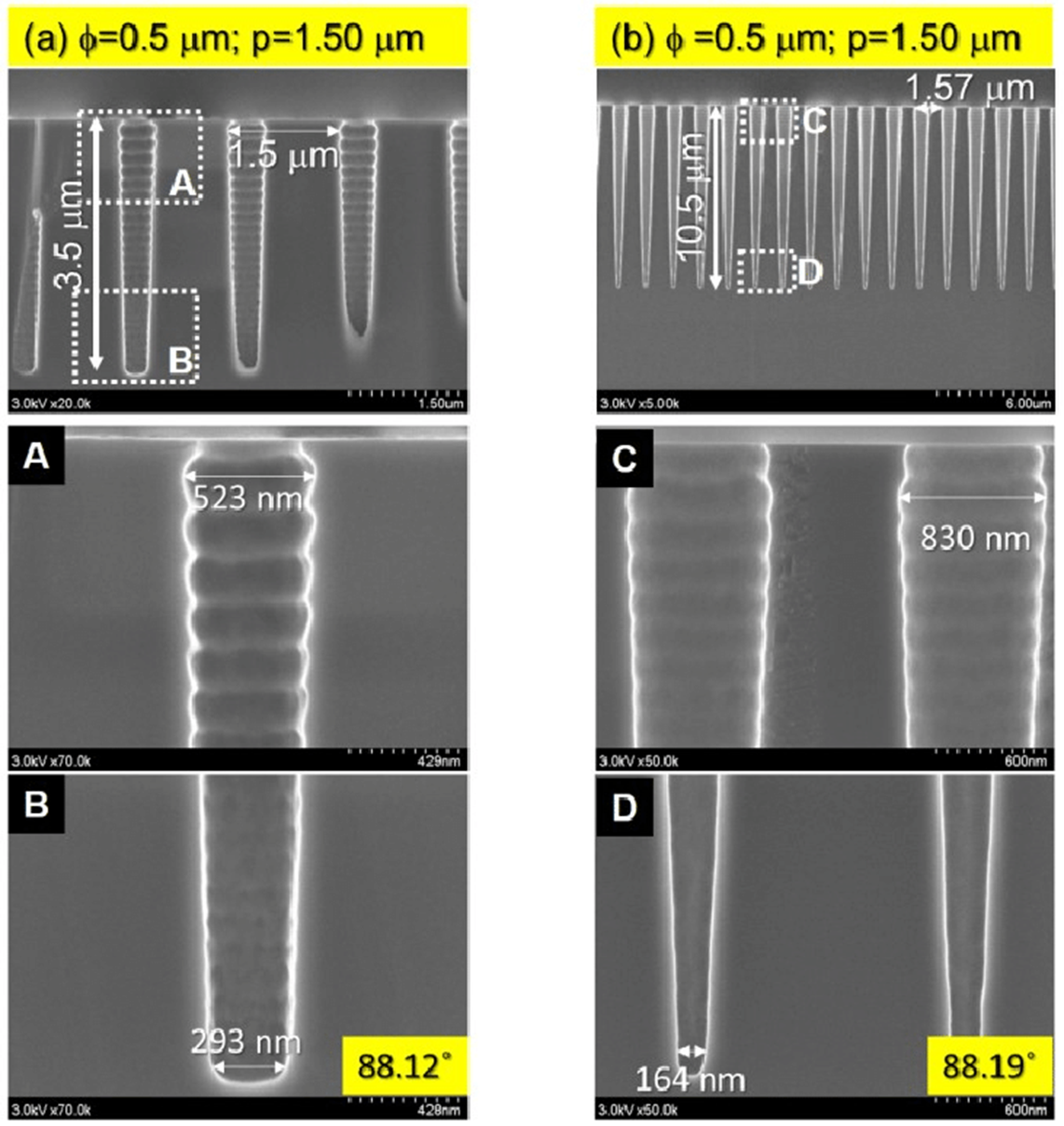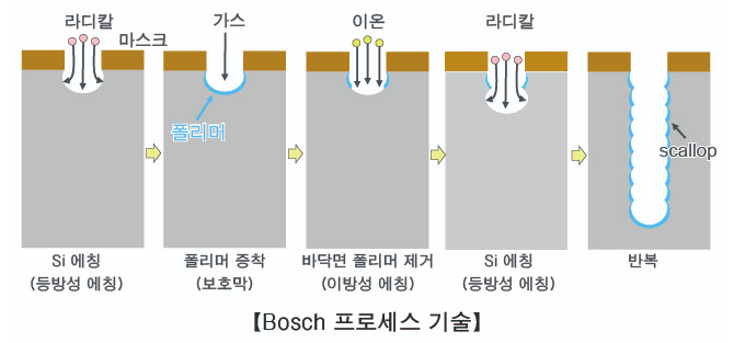 Bosch Prcoess는 일반적으로 Deep RIE 공정으로 등방성 & 이방성 Etching의 장점을 조합하여 높은 Aspect Ratio의 Profile을 구현하는 기술입니다. 일반적인 RIE 공정에서 Plasma 내의 반응종인 Radical에 의해 Si Etching이 진행됩니다. 이때는 Chemical Reaction에 의한 등방성 Etching의 특성이 강합니다. 다음 Step으로 Passivation Gas에 의한 Polymer Layer를 형성하고, 이후 높은 에너지를 가진 양이온의 물리적 타격으로 식각을 진행합니다. 이때는 이방성 식각 특성이 강합니다. 이를 반복하면서 매우 깊은 Vertical Profile 구현이 가능해집니다. "Bosch Process를 통해 얻은 Profile은 'Scallop'라 해서 항아리 모양의 요철이 반복적으로 형성되는데 이는 아래 그림을 참고하시길 바랍니다"