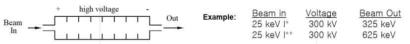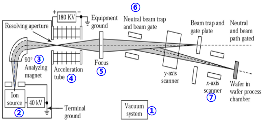 ① Vacuum System : 1E-07~1E-08 Torr의 진공환경으로, Diffusion Pump나 Ion Pump가 Main Pump로 사용됨. ② 이온공급장치 : Discharged Plasma (Hot Filament에 의한 Hot Carrier 생성) → 가속 → 중성원자 충돌 → 이온 생성. 사용가스는 Dopant Type에 따라, 혹은 Doping Profile, 인가 Energy에 따라 질량을 고려하여 BF3, PH3, AsH3, BCl3, AsF3 등등 다양한 Source가 있음. -생성 이온 : 10B(19%), +11B(81%) in BF3, / Ion 종류 : 10B+, 10BF+, 10BF2+, 10BF3+, F2+, .... ③ 분류기 : 원하는 이온을 선택하는 부분. Magnet이 있어 원하는 이온을 선택할 수 있음. 이는 이온질량분석기로 가속된 하전입자의 질량에 따라 자계 내에서 Path의 변경을 제어하여 원하는 Type의 Ion을 추출할 수 있음. ④ 가속기 : keV Energy 가속. 주입 에너지의 가속. [Beam in - High Voltage - Beam Out] 세 영역으로 최종 Ion Beam이 Out 되는 Energy를 산출하여 Doping Profile의 Junction Depth를 제어함. 일반적으로 Beam In 영역은 Ion Beam을 발생시키기 위해 필요한 Energy임.