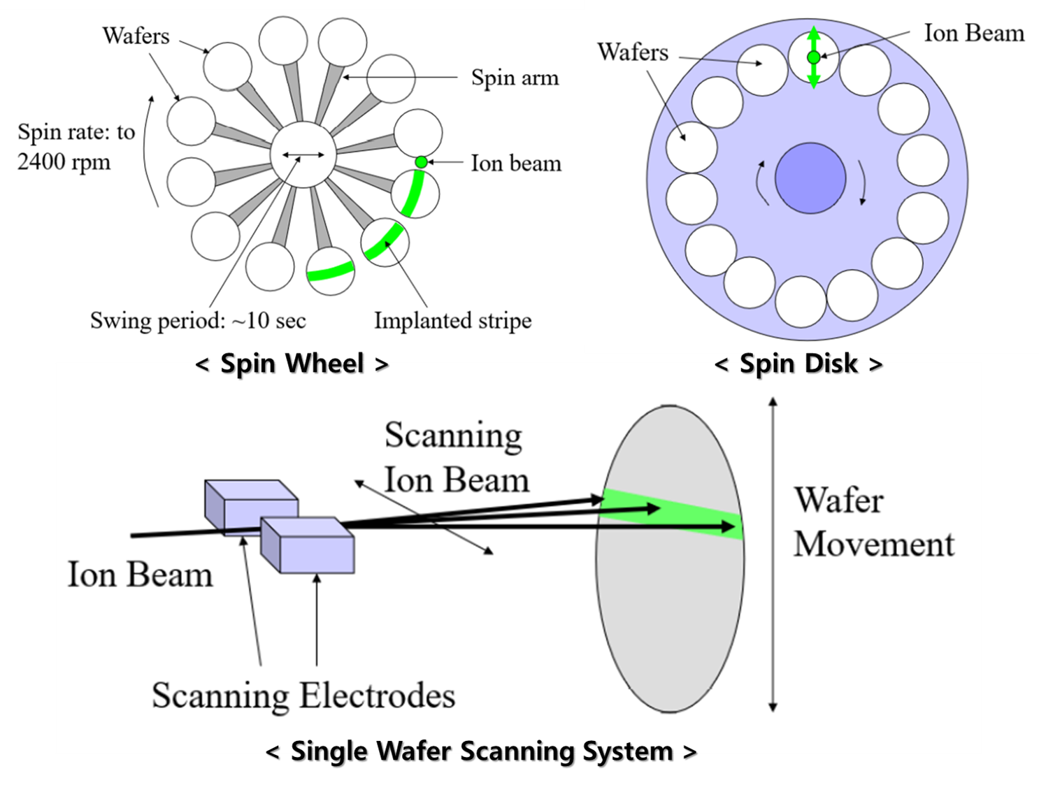 [Wafer Handling] 1. Ion Beam 직경 : ~25mm (~1 inch) 2. Wafer 직경 : 200mm (8 inch) 또는 그 이상 3. Wafer 전체에 Ion Beam을 Scan 하기 위해 Beam or Wafer or 둘 다 움직일 필요가 있음. -Spin Wheel / Spin Disk / Single Wafer Scan