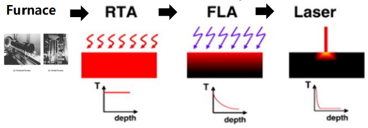 미세화 트랜드에 따라서 점점 더 얇은 Junction Depth를 구현하기 위해 Annealing 기술이 개발되고 있습니다. 확산거리를 최소화하고, Activation을 높이기 위해서 열처리 온도는 높아지고, 시간은 짧게 하는 방향으로 발전하고 있습니다. 온도를 높일수록 Activation 정도를 높일 수 있습니다. 하지만 온도가 높아질수록 확산거리가 증가하기 때문에 LSA와 같은 Laser Annealing 기술로 원하는 Junction Depth 부위에만 국부적으로 열처리하는 기술들이 요구됩니다. 그래서 초기의 Furnace → RTP → FLA → LSA 단계로 확산을 줄이고 활성화를 증가시키는 열처리 기술들이 채택되어 적용되고 있습니다.