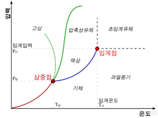임계점 이상의 온도와 압력에 놓인 물질의 상태를 말합니다. 초임계 상태에 있는 물은 금조차 녹일 수 있으며, 셀룰로스나 다이옥신까지 분해할 수 있습니다. 초임계 상태의 이산화탄소는 여러 가지 물질을 잘 용해하며, 임계점 이하가 되면 기화하여 용질만 남습니다. 온도와 압력에 따른 물질의 상 그래프 (이미지 출처 : 위키피디아)