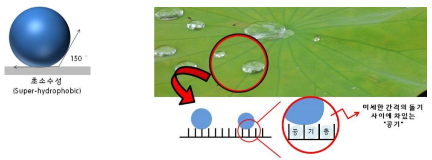 초소수성은 접촉각이 거의 150도 이상입니다. 이러한 초소수성의 표면은 Self Cleaning 효과를 가지고 있습니다.
