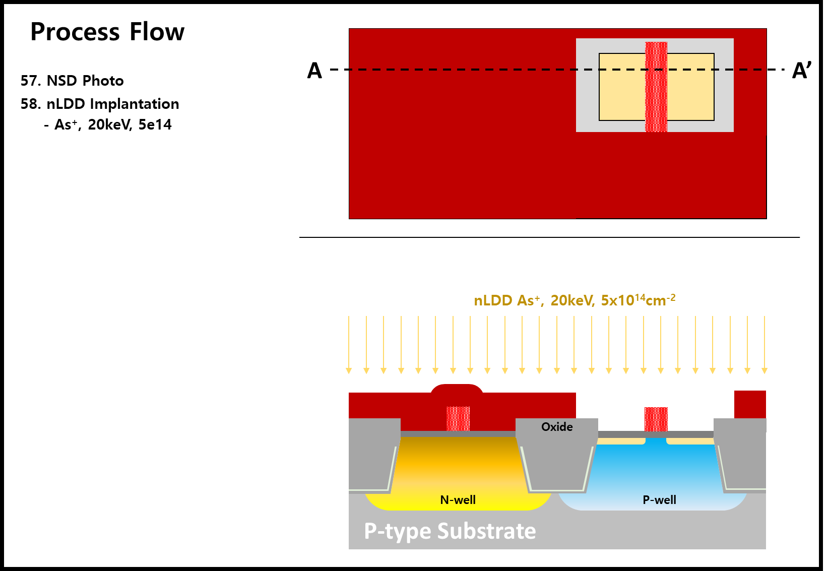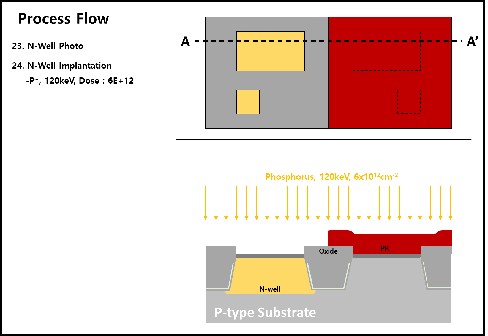 우선 CMOS에서 PMOS가 형성될 N-Well을 형성해줍니다. Photo 공정을 통해 PMOS 영역만을 Open하고, Phosphorus를 Doping 해줍니다. 뒤에서 나올 LDD, Source/Drain Doping과 달리 N-well은 깊히 Doping 해야 하므로 120keV의 높은 에너지를 사용하는 것을 확인할 수 있습니다.