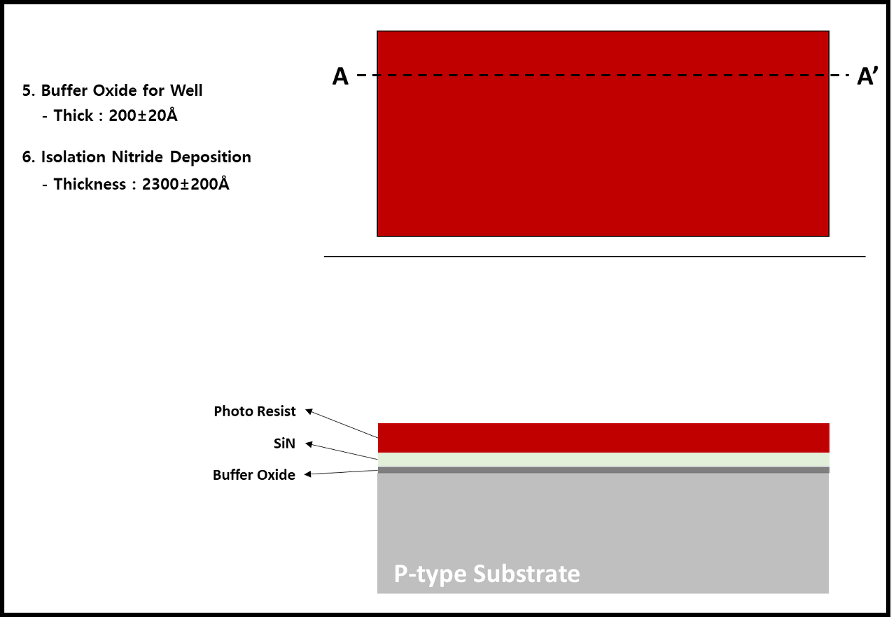 ① p-type Si 기판이 준비가 되면 위와 같이 Buffer Oxide를 형성하고 Nitride를 형성한 후 Pattern을 형성하기 위해 Photoresist를 도포합니다.