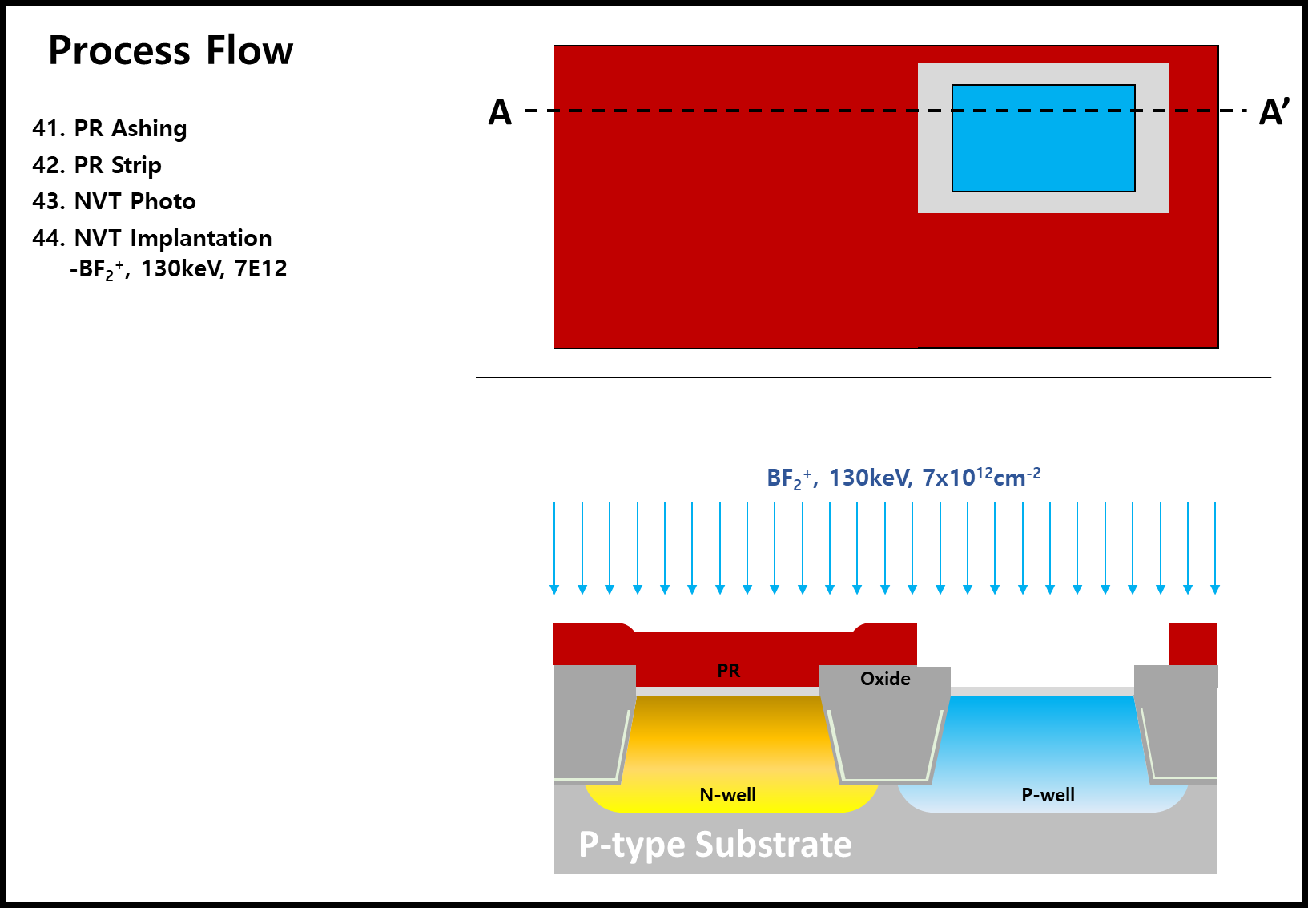마찬가지로 NMOS의 Vt를 Modulation 해줍니다. 여기는 Dopant Type을 BF2+를 사용했습니다. Boron은 질량이 매우 작은 가벼운 이온입니다. 그러다 보니 우리가 원하는 이온분포를 구현하기 위해서 설비 상의 이유로 원하는 Spec의 Ion Energy를 확보하지 못하는 경우가 있습니다. 이럴 경우에는 Boron의 화합물을 이온으로 추출하여 질량을 무겁게 하여 주입하는 방법을 적용할 수 있습니다. 정말 똑똑하고 재밌죠.