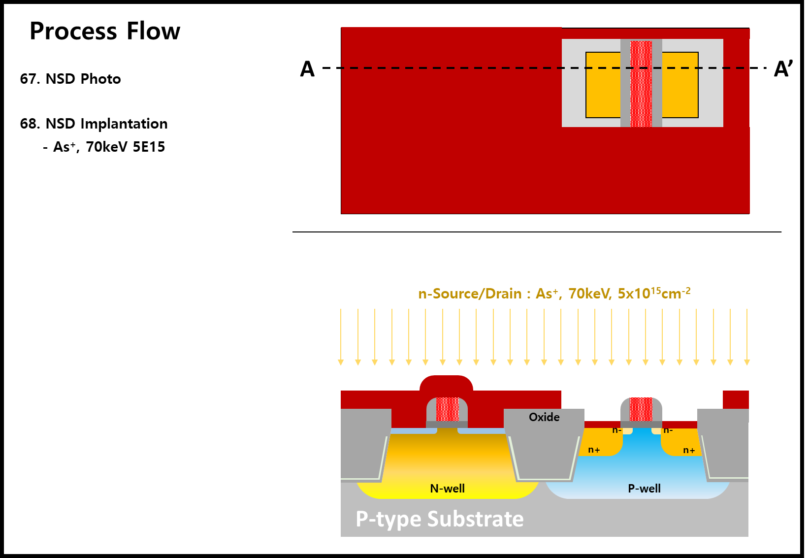 위와 같이 NMOS의 Source/Drain을 형성해줍니다. 여러분들이 공정엔지니어 직무를 수행하면 가장 골머리를 썪이는 것이 바로 Implant라고 생각됩니다. 소자의 전기적 특성에 가장 큰 영향을 미치거든요. 여기서 여러분들이 한 가지 숙지하고 있으면 여러분들 인생에서 가장 크게 도움이 될 만한 Tip을 알려주면, "소자에서 가장 Doping 농도가 높은 영역은 Source/Drain 영역" 입니다. 어찌보면 당연하고 뭐야... 라고 생각하실 수 있지만, 간단하면서도 정말 중요한 어떻게 보면 몰라서는 안 될 상식이라고 보시면 됩니다.