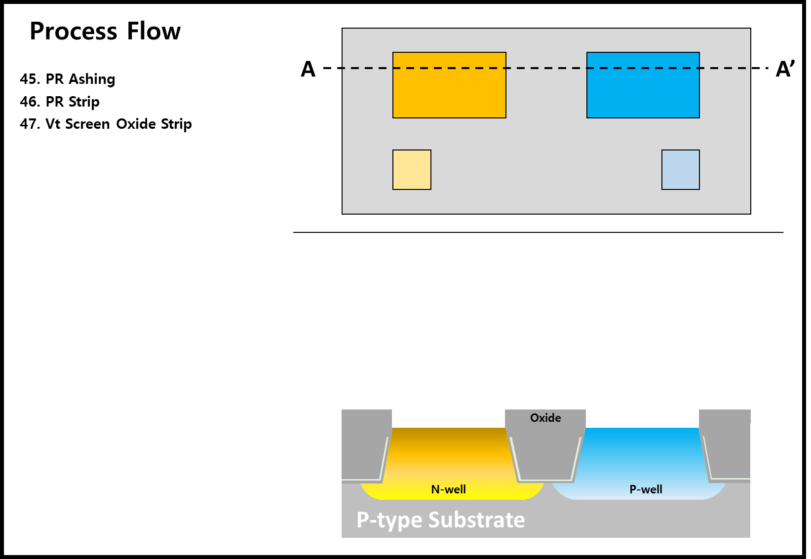 이번 단계에서는 소자의 동작 특성 중 가장 중요한 Threshold Voltage를 Modulation 하는 단계입니다. 이전 공정을 마무리 하기 위해 PR을 제거하고 Well을 형성하기 위해 주입했던 Dopant들이 Activation 그리고 고에너지로 주입된 이온에 의해 손상된 결정 격자를 Curing 하기 위해 Annealing (Drive-in)을 진행합니다. Well을 형성했으니, Buffer Oxide를 제거해주고, Vt Modulation을 위한 Implant 이전에 얇은 Sacrificial Oxide 희생산화막을 형성해주고 제거합니다. 성장하고 바로 제거할 것이면 뭐하러 만드는가. 아닙니다. 아무것도 아닌 것 같지만 정말 중요한 Step입니다.