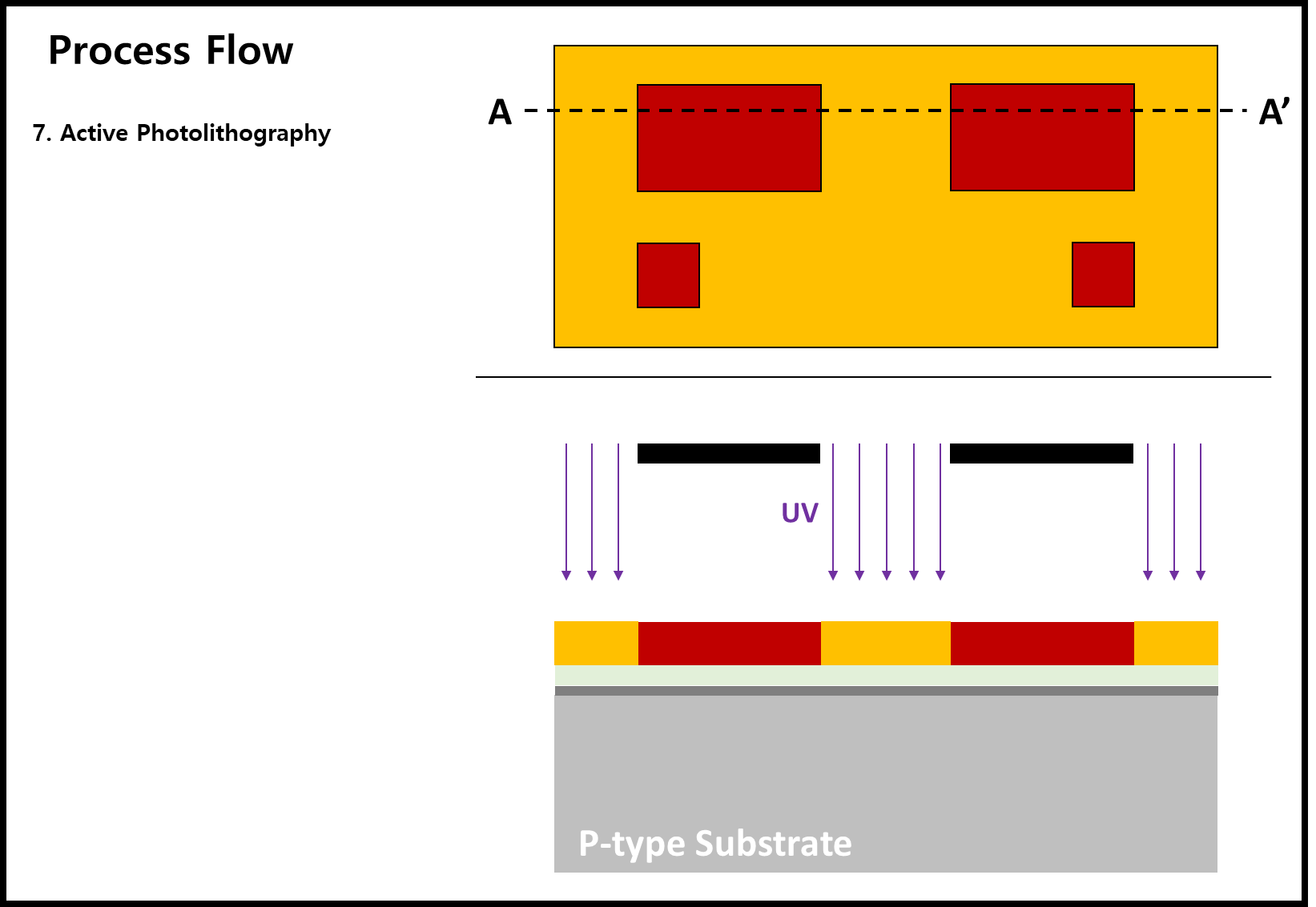 ① 이제부터 Main 공정이 진행된다고 보면 됩니다. Wafer 상에 설계한 회로를 전사하기 위해서 Photoresist를 Coating 한 후 회로 패턴 정보가 포함된 Mask를 Scanner & Stepper 상에 Align한 후 규격화된 빛을 노광합니다. 어떤 Process Flow 상에서는 Well을 먼저 형성하고, Isolation을 진행하는 경우도 있고 FAB 마다 모두 다르고 할 수 있습니다. 위와 같은 경우에는 Isolation 공정이 선행되는 것을 확인할 수 있습니다.