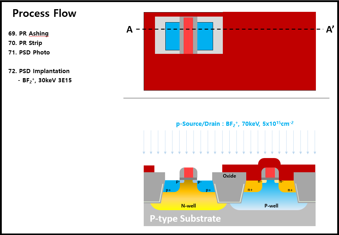마찬가지로 PMOS 또한 Source/Drain을 형성해줍니다. LDD < Source/Drain < VT Modulation < Well 순으로 이온 깊이가 깊은 만큼 가속에너지 혹은 Dopant Type (Ion Mass)를 비교해보면서 공학적인 안목을 길러보세요.