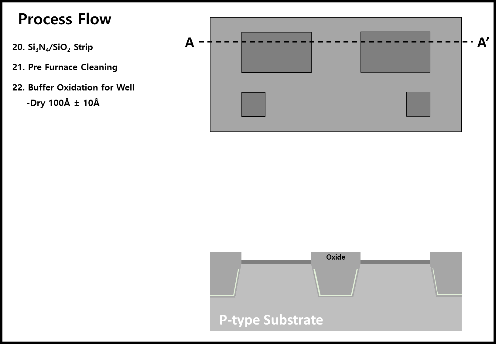 자 이제, Nitride의 역할은 끝났으니 제거해줍니다. 이제 우리는 본격적으로 Active 영역에 대해서 다룰 것입니다. Well을 형성해주기 위해서 우리는 Buffer Oxide를 성장해줍니다. 앞서 Buffer Oxide의 역할에 대해서 다시 한 번 숙지해주시길 바랍니다.