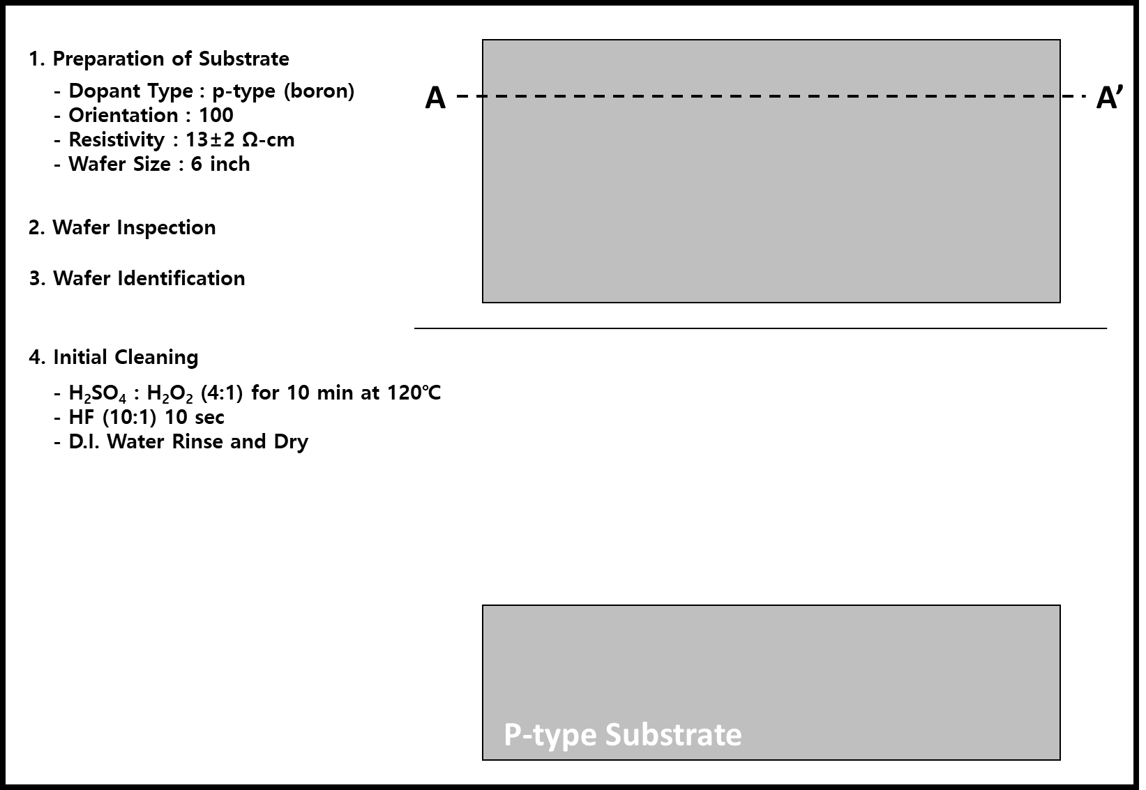그래서 가장 안정적인 결정 방향인 100 면을 Base Substrate로 사용합니다. p-type Si Substrate를 보시면 저항과 Wafer Size의 정보를 Wafer 업체에서 확인할 수 있습니다. Wafer가 준비되면 정상적인 Wafer인지 다양한 검사를 진행하고, 잠시라도 대기에 노출되면 형성되는 얇은 Native Oxide Layer 혹은 이물을 제거해주기 위해 Pre-cleaning을 진행합니다.
