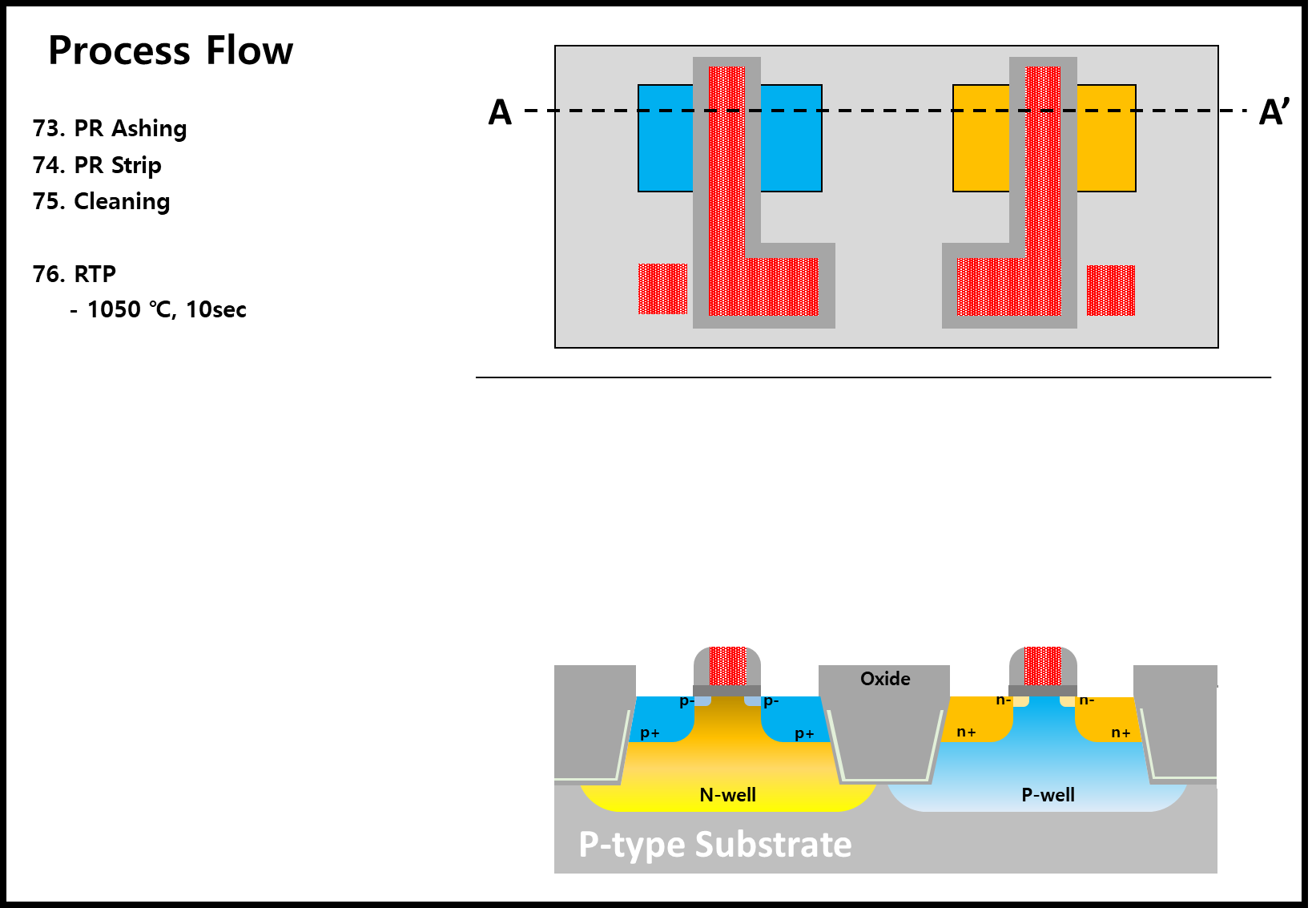 PR을 제거하고 주입한 이온을 Activation 시키고 이온주입에 의해 손상된 결정을 Curing 하기 위해 Annealing을 진행해줍니다. 여기서 중요한 점은 기존 DRIVE-IN이 Furnace 내에서 고온으로 Annealing 했다면 이곳에서는 Rapid Thermal Process, RTP 급속 열처리가 진행됩니다. 공정 시뮬레이션을 진행하다보면 RTP 시간에 따라 Junction Depth 짧은 시간 차이에도 엄청난 차이로 깊어지는 것을 확인할 수 있습니다.