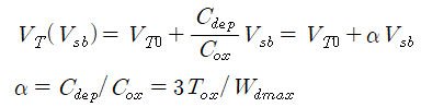 하지만 Vs와 Vb가 전위차를 가지게 되면, source와 body 사이에는 Vsb 전위가 형성되고 Channel과 Body 캐패시터에 Cdep 캐패시턴스 값에 의해 Qinv = Cdep*Vsb (Q=CV공식) 전하가 유도됩니다. 따라서 Vs=Vb일 때와 다르게 반전층의 총전하량은 다음과 같습니다.