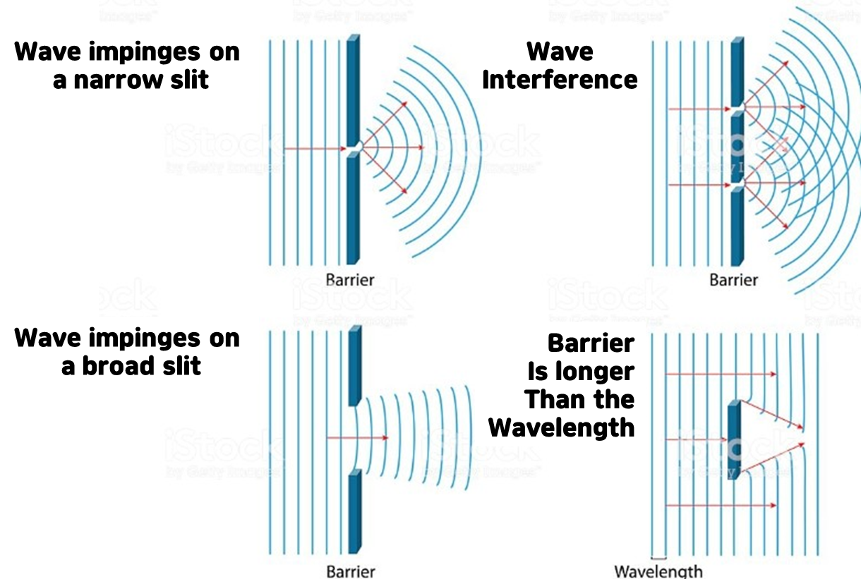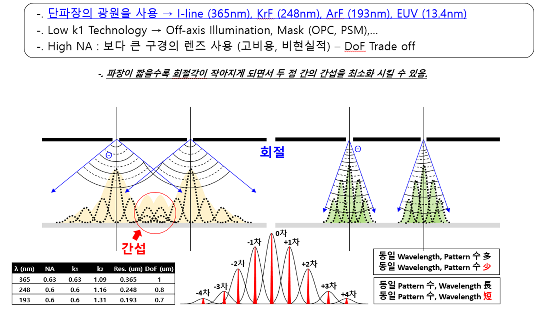 포토공정에서 마스크가 담고 있는 회로정보를 웨이퍼로 전달하는 매개체는 빛입니다. 빛은 파동성을 지니기 때문에 특정 패턴을 만났을 때, 빛의 경로가 틀어지거나 퍼지는 특징을 가집니다. 이것이 바로 빛의 회절현상입니다. 빛의 파장이 짧아질수록 빛이 퍼지는 회절 현상이 최소화 됩니다. 빛의 파동성은 회절 외에도 간섭의 특징을 가집니다. 회절된 두 파형이 만나면 서로 간섭을 일으켜 보강간섭, 상쇄간섭에 의해 주기성을 갖는 위상정보를 전달합니다. 이 정보가 바로 설계한 회로 정보라고 할 수 있습니다. 회절이 커질수록 특정 패턴간의 이미지 정보가 담긴 빛이 간섭에 의해 정보가 손실되면서 Resolution이 저하되는 것입니다. 따라서 단파장의 빛을 사용함으로써 이러한 회절현상을 최소화해 더 작은 Resolution을 확보할 수 있습니다.