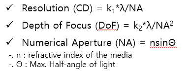 Resolution을 정의하는 식은 Rayleigh Equation (레일리 방정식)으로 Resolution은 파장이 짧아질수록, 설비 내 렌즈의 크기를 나타내는 NA값이 커질수록 작아집니다. 즉, 더욱 미세한 패턴을 형성할 수 있음을 의미합니다. 앞서 말씀 드린 것과 같이 파장은 점점 더 짧은 파장의 광원을 사용하는 공정을 개발하고 있습니다. 또한 렌즈가 포착할 수 있는 최대 회절각으로 크면 클수록 이미지 정보를 포함한 회절광들을 모을 수 있기 때문에 NA가 커지면 커질수록 작은 Resolution을 확보할 수 있습니다. k1은 공정난이도를 나타내는 공정상수로 조명계 (Illumination), OAI (Off-axis Illumination Mode), Mask (OPC, PSM), Multi Patterning 등 다양한 방법을 적용하여 Low k1 Tech를 개발하여 Resolution을 작게 하는 기술들이 개발됐습니다.
