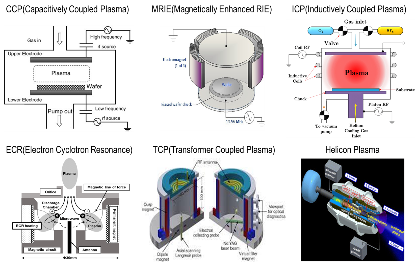 ⑤ HDP (High Density Plasma) Plasma Density가 10e+11 이상인 Plasma를 통틀어서 HDP로 표현합니다. 저압에서도 안정적이고 균일한 Plasma를 유지할 수 있으며, 역시 Plasma Density와 Ion Energy를 독립적으로 Control할 수 있는 특징을 가집니다. Process Window 마진이 비교적 좁고, Electron의 에너지가 높아 Process를 Control 하기 어렵다는 단점이 있습니다. 위에서 언급한 ECR, TCP, Helical, ICP 모두가 해당된다고 할 수 있습니다.