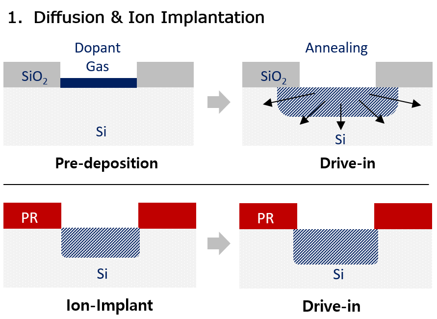 반도체 제조 공정에서 대표적인 Diffusion 공정은 바로 Doping입니다. 고체 Si Wafer에 Dopant 원자를 도핑하고, 원하는 접합 깊이 및 분포를 제어하는 공정입니다.이온주입 공정으로 구분하기도 하지만 공정 메커니즘은 명확히 Diffusion이라 할 수 있습니다. 반도체 제조 과정에서 Electrical Isolation을 위해 Well Formation, Vth Adjust Imp., LDD/Halo, Source/Drain, Tap 등 Active 형성 그리고, 저항 Passive 소자 특성 변경 등 반도체 제조공정에서 Diffusion 공정은 정말 중요하다고 할 수 있습니다.