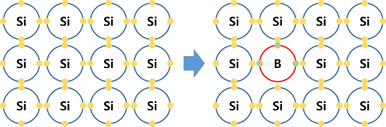 Dopant 원자들은 Si 결정격자 내 Si 원자가 비어있는 Vacancy로 이동하거나, 결정격자 사이를 Dopant 원자들이 이동합니다. 실제 Doping 시 Activation이 되어 과잉의 Carrier를 만들어내는 Mechanism은, Dopant 원자가 Si 결정격자 원자를 치고 들어가 인접 Si과 결합을 통해 과잉캐리어를 만들어내는 '치환'의 개념을 생각하시면 될 것 같습니다. 치환형