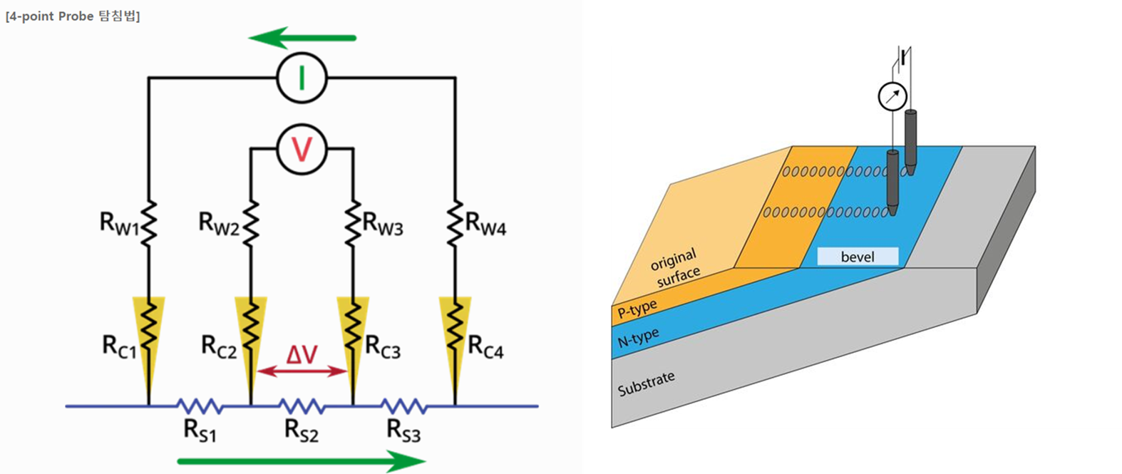 Doping 농도를 측정하는 데 있어서 가장 접근성이 쉬운 방법은 바로, 막질의 Sheet Resistance 즉, 시트저항을 측정하는 것입니다. 대표적인 방법으로 4-Point Probe 방식이 적용되며, 일직선으로 배열된 4개의 Probe를 Wafer 표면에 접촉시켜 Sheet Resistance를 측정합니다. 두 번째 방식은 SRP (Spreading Resistance) 측정 방법입니다. Wafer, Sample을 5~15deg. 일정한 각도로 연마한 후에, 연마된 면을 따라 2개의 Probe를 일정 간격으로 Shift 시키면서, 두 Probe에 Current를 Forcing한 후 Voltage를 측정합니다. 두 Probe의 이동거리와 연마 각도 등을 계산하면 깊이 방향에 따른 저항과 Doping Profile을 평가할 수 있습니다. 4-Point Probe Measurement (좌), Spreading Resistance 측정 (우)