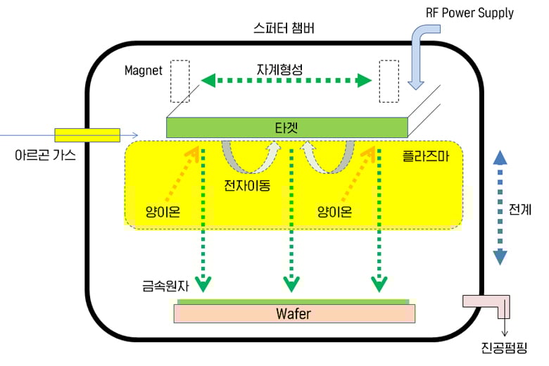 DC Sputter의 경우 양극에 DC Power를 인가하여, target 면에 수직한 면으로 전기장이 형성되면서 Plasma를 발생시켜 Sputtering 하는 것이 주요 Mechanism입니다. Magnetron Sputtering의 경우, DC Sputtering과 마찬가지로 Target의 수직면에 전기장을 형성하고, Coil에 전류를 인가하여 Target의 수평한 방향으로 자기장 유도함으로써 전자가 Target 표면 근처에서 나선운동을 하게 됩니다.그 결과, Sputtering이 일어나는 Target 표면 근처에서 Ar을 집중적으로 이온화시킬 수 있고, Anode로 빠져나가는 전자의 loss를 최소화 하여 Ar과의 충돌확률이 크게 증가하면서 Sputtering 효율을 획기적으로 향상시킬 수 있습니다.