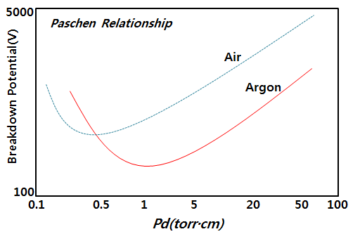 Sputtering에서 Deposition rate은 당연 Plasma Density와 밀접한 연관이 있습니다. 따라서, Plasma Density를 조절하면 Deposition rate을 Control 할 수가 있습니다. Sputtering에 적용되는 Abnormal Glow 방전을 형성시키기 위해서는 Gas Breakdown을 일으키기 위한 충분한 전압(방전개시전압)이 필요합니다. 이 전압은 여러 공정변수와 상관관계를 가지고 있습니다. 파센 커브 이는 챔버 내 압력과 전극사이의 거리 그리고 방전개시전압과의 관계를 나타낸 파센 커브로 설명드릴 수 있습니다. 챔버 내부에 압력이 너무 낮은 경우, Ar 기체입자의 양이 작아지기 때문에 충돌확률이 작아지면서 Plasma Density가 작아지게 됩니다. 반대로 압력이 너무 높은 경우, 2차 전자의 Mean Free Path가 짧아 Ar을 이온화시킬 정도의 충분한 에너지를 가지기도 전에 Ar 기체입자들과 충돌하여 에너지를 잃게 됩니다.