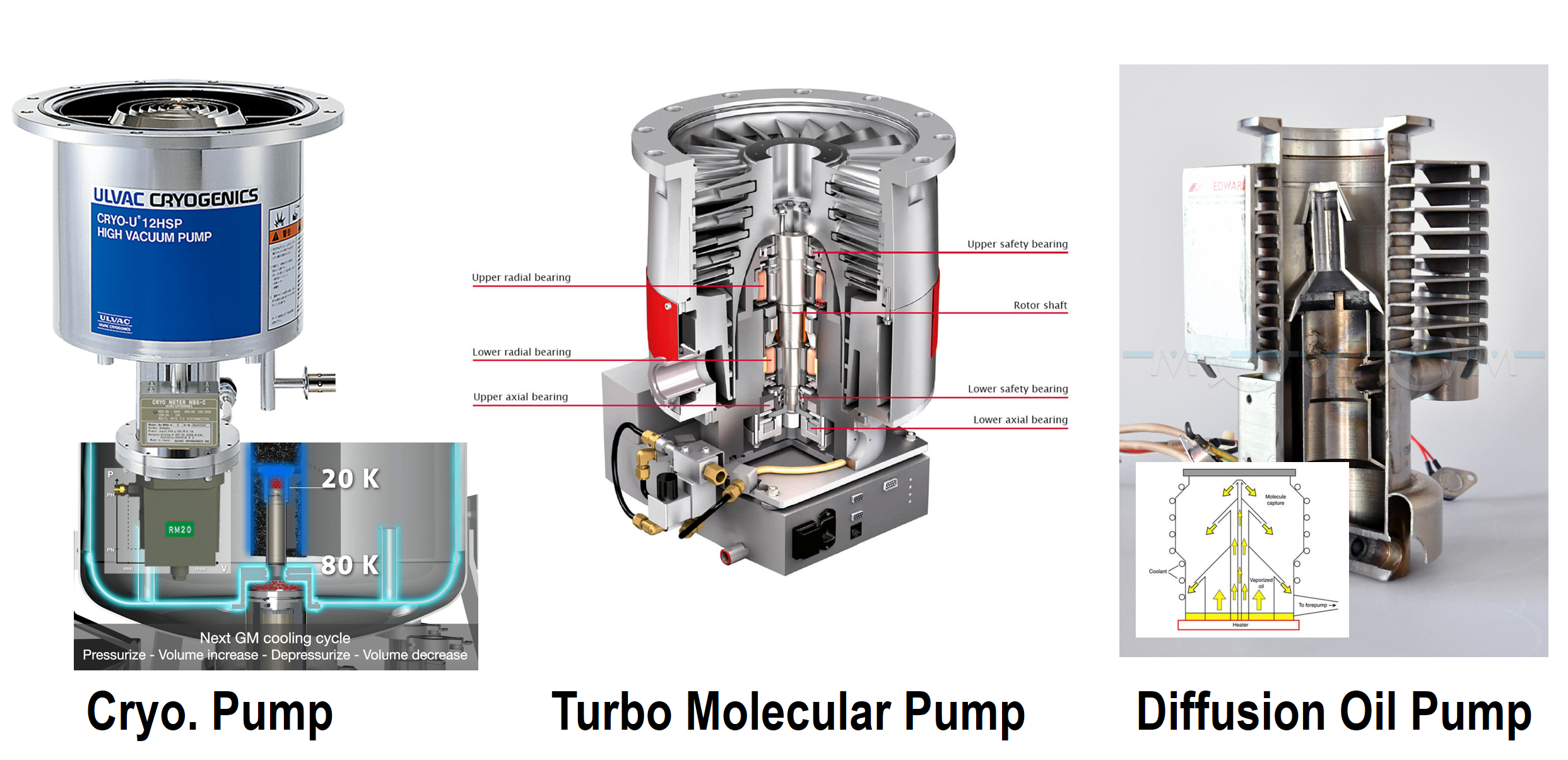 Diffusion Oil Pump의 경우, Evaporator에 주로 사용되는데 외부 Heat Coil로 Pump 내 Oil을 가열하면 Vapor 형태의 oil 입자들이 증기압에 의해 확산되었다가 냉각수 라인을 만나 액화되면서 챔버 내 입자들을 끌어내림으로써 고진공을 형성합니다.