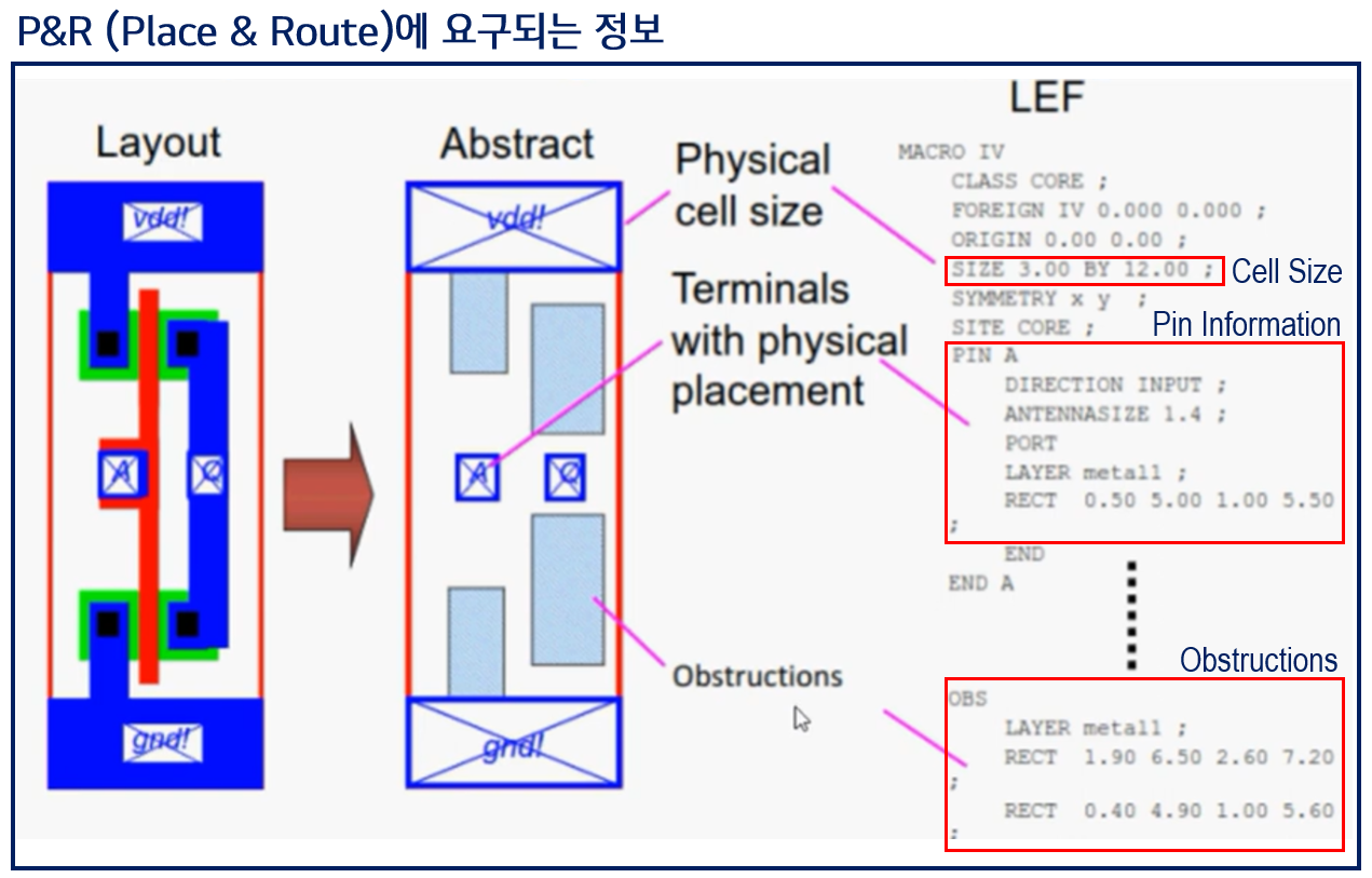 P&R (Place & Routing)을 위한 Abstract -. Readable ASCII Format -. Connecting을 위한 세부 Pin Information 포함 -. Poly, Diffusion 등 Front-end line의 Layer Data는 포함하지 않음. -. DRC (Design Rule Check)을 위한 Blockage 포함.