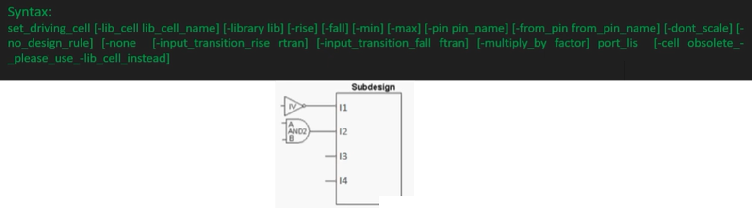 -. input or inout ports에서 Tech Library의 Cell에 의해 구동되는 구동 특성을 정의합니다. Input Ports를 가지는 Library Pin들의 정보를 기반으로 Delay 계산을 정확하게 Modeling 할 수 있습니다. 즉, 특정 명령어가 Input Port 구동 특성을 정의하고, 이를 통해 Technology Library의 Pin과 연결하여 더 정밀한 Timing 계산이 가능하다는 것입니다.